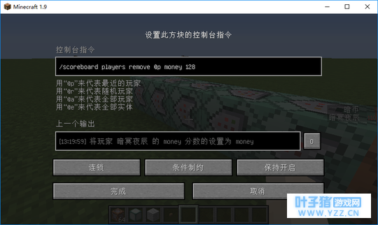 执行命令 /scoreboard players list 暗冥夜辰 服务器商店 刚刚我们已经学习了记分板如何使用。创建好一个以虚拟值为准则、名字叫暗币、内部名称为name的记分板,并且设置好显示玩家分数的位置。接下来我们利用刚刚讲的命令和一些新命令制作收购物品和卖出物品的命令。 在聊天栏输入: 创建记分板:/scoreboard objectives add money dummy 暗币 设置显示位置:/scoreboard objectives setdisplay list money (显示在列表) /scoreboard objectives setdisplay sidebar(显示在侧边栏) 获得命令方块:/give @p minecraft:command_block