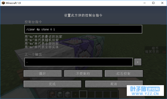 7号命令方块 这个命令的作用是按下按钮后循环 (每秒执行20次,按钮2秒弹起 ) 清除最近的玩家背包中的一块石头,直到玩家背包中没有石头或者按钮弹起为止。将循环改为脉冲则只清除一块石头。 该命令的原有格式是:/ clear [ 玩家 ] [ 物品 ] [ 数据值 ] [ 最大数量 ] [ 数据标签 ](相信从头看过我写的每一期的朋友现在已经看得懂这串吧啦吧啦是什么东西了吧!) 8号命令方块 中输入:/scoreboard players add @p money 5 并设置命令方块为 连锁 条件制约 保持开启 。 (这里有人问为什么不用红石,因为有连锁模式和保持开启功能,更小、更稳定、更灵活(反正就是好,我不管我不管!!))
