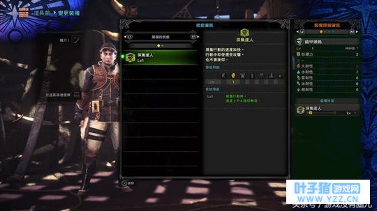 在家中有三套装备和若干武器选择,三套初始装备的属性为:采集达人(加速采集与无后仰)、饥饿耐性(适量抑制耐力表减少)、探索者的幸运(活性化采集点UP)。