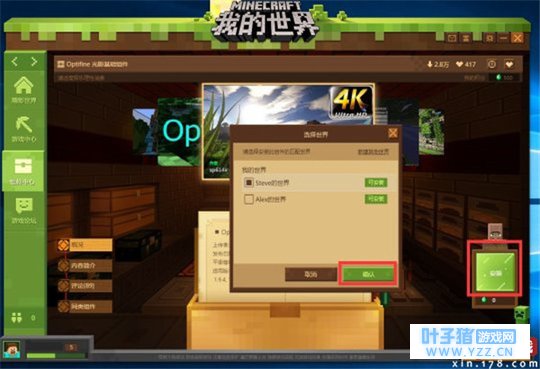 第三步:点击右下角的安装按钮,选择需要安装组件的本地存档或新建世界,点击确认即可快捷加载。