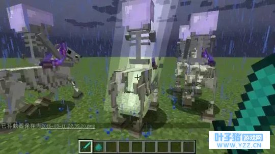 鞘翅:能够让你滑翔的工具,可在末地城找,生存模式想要找到它相当困难。 骷髅马:雷雨天自然生成,谈不上很稀有,雷雨天认真找的话能发现两三匹。