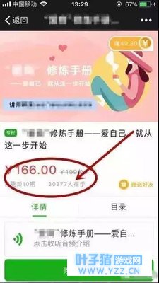 老郭特意加过去看了下,原来这个家伙在公 众 号里面销售心理和情感的课程,她非常的聪明,因为“情感”类的内容不需要太高的专业能力,只要稍加学习,很多人都能做情感导师。一般而言,宝妈通常心理焦虑不安,处于人生一个非常动荡的时期,有些宝妈老公对自己不好,或者有婆媳关系矛盾,产后抑郁等各种心理问题,所以这样的内容对宝妈们来说可谓是雪中送炭、心灵鸡汤,很多人都愿意买单。 如下图,她的课程售价166元,看下方销量已经达到3万多笔,单算这块已经有500多万,此外还有很多小课程20多块,也都是几万几万的销量,这里面有多少利润你们自行想象。其实话说回来,做这些课程很难吗?并不难,你在网上到处搜集些资料,整合提炼一下,就能直接拿来用。当然人家做这么大销量,背后的工作肯定也不少,所以肯定是团队运作的。如果自己操作类似项目,即使做不到团队操作的这么专业,但赚点小钱还是不难的。