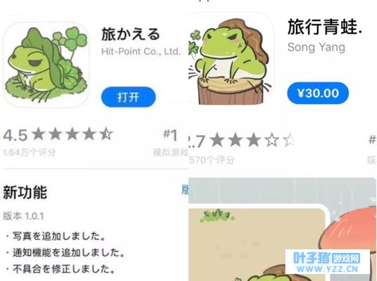 ☝ 图左为官方正版《旅行青蛙》 细心的玩家发现 《旅行青蛙.》只是《旅かえる》的山寨版 游戏直接使用了《旅かえる》的中文译名 但“蛙”字后面有个点