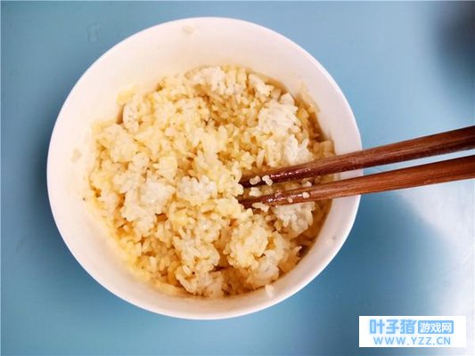 2. 鸡蛋打散,倒入准备好的米饭混合均匀。