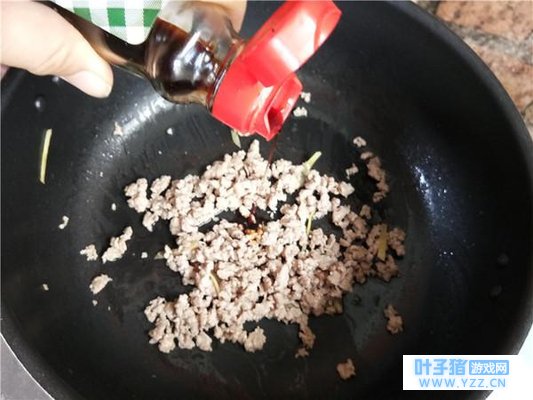 4. 肉末炒至变色后加适量酱油。