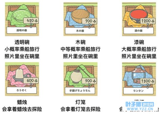 道具 : 不同种类的道具对蛙蛙的旅行有不同的引导。商店的右上角是抽奖的入口,用五张奖券可以摇一次奖。