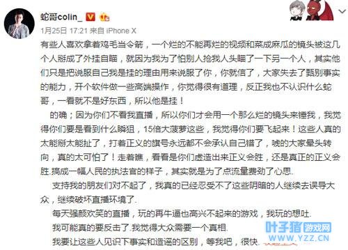 全球电竞网电竞世界原创内容,禁止转载,如需转载请联系本站授权。 在这个信息时代,一个人如果不在焦点位置,很快就会被遗忘。从2017年底到2018年初,蛇哥多次被UP主质疑开挂。 12月30日,蛇哥邀请了部分业界人士进行线下演示。但以午后狂睡为主的游戏人及网友,认为蛇哥并未洗清自己的嫌疑,要求二次演示。但在双方协调下,最终决定,如果在国服上线后,蛇哥打出的操作让午后狂睡觉得没异议,那么第二次约战取消。如果依旧存疑,蛇哥将当着官方人员的面来回应(自证)。但1月8日,午后狂睡又在微博表示,“自从上次第二场约战不答应我就懂了。这天下,无敌的终究是脸皮。”似乎认定了蛇哥开挂。 不过,这次放视频惹怒蛇哥的可不是午后狂睡,而是另外一名游戏博主,P城张主任。1月24日下午2点半,P城张主任在微博放出视频,据本人表示,是原封不动从斗鱼视频中拿来的。在这段视频中,蛇哥又出现了疑似自瞄的操作。