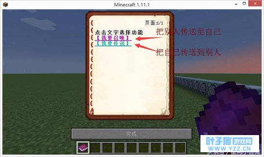 如图所示,玩家通过书本(tellraw等选择也可以)选择功能之后,会变为旁观模式 此时玩家虽然是旁观模式但是动弹不得(防止乱飞也是指令需要) 然后玩家按下鼠标滚轮(别告诉我你们不知道滚轮是可以按下去的) 之后可以选择传送到一个玩家 选择之后玩家立刻变回生存,并向被选择的玩家发出请求 而对方可以选择同意或者拒绝 更新:结合银行系统的ooc已经制作完成 召唤需要消耗1钻币,传送不消耗钻币 需要在附件中下载使用相应版本ooc,并前往下述链接下载实物银行ooc http://mc.netease.com/thread-122178-1-1.html 详细过程: 玩家选择功能后,立刻将玩家调为旁观模式并原地生成盔甲架,将玩家定在盔甲架处 同时玩家会被分配uid,并同步到盔甲架上 在旁观模式选择传送到某一个玩家后,立刻给双方加tag并同步uid,之后让玩家返回盔甲架位置(因为玩家立刻区块1秒后区块卸载,而此过程不到1秒,所以不用担心距离过远盔甲架不加载的问题,当存在多个盔甲架的时候,由于玩家和属于自己的盔甲架有相同的uid,所以会通过比对分数来回到正确的位置) 返回盔甲架位置后,玩家变回生存,等待对方回复 收到请求的一方若同意,则会通过比对uid的位置传送到正确的玩家或者把正确的玩家召唤过来 如果拒绝则回复对方拒绝信息 步骤图解: 有些玩家懒得看字GIF太快了看不清于是发出分步图