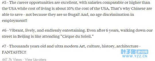 # 5 -就业机会非常好,薪水比美国高,而生活成本约为美国的35%。这就是为什么中国人能够存钱——不是因为他们太节俭了!而且,在就业方面没有年龄歧视!! #6 -充满活力、充满活泼、充满无限的娱乐。即使过了6年,在北京街头漫步就像参加 " 太阳马戏团。" # 7 - 数千年的历史,超现代的艺术,文化,历史,建筑——太棒了!!