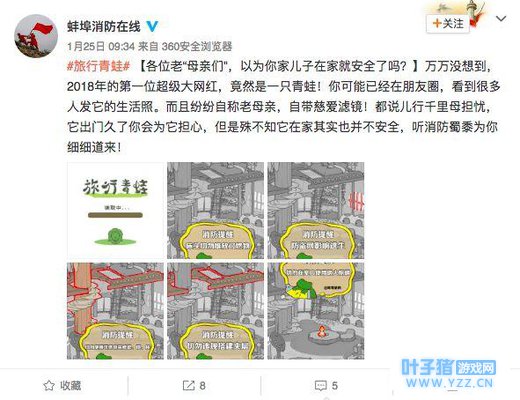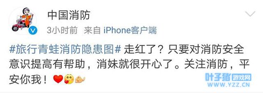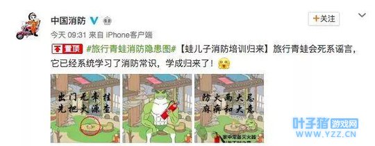 图片来源:@中国消防 今天,公安部消防局又发微博,称旅行青蛙会死系谣言,它已经系统学习了消防常识,学成归来了!