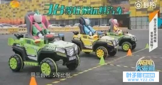 模拟碰撞实验: 三台儿童小汽车上安装有五点式安全座椅,三个假人模拟三个一岁的宝宝,实验中给它们穿上了羽绒服。