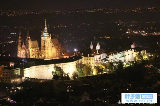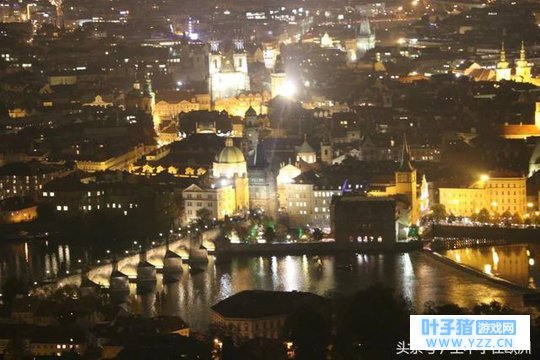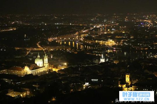 从鸟瞰点看夜晚的布拉格,如同飞机视角: 夜晚的布拉格,并没有万家灯火。除了伏尔塔瓦河沿岸成排的灯光,你甚至很难看到一个主干道。夜晚里最显眼的灯火,是图片左下方的布拉格城堡。