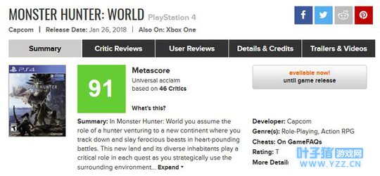 根据Metacritic统计,目前《怪物猎人世界》平均媒体评分已经达到91分,这在日本游戏中是极为罕见的。其中IGN甚至给出了9.5分好评。