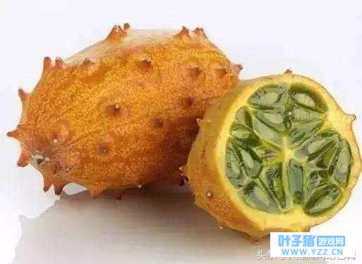 9.非洲角瓜 非洲蜜瓜,火参果,火星果,火天桃,爆炸果。为葫芦科黄瓜属一年生的蔓性草本植物, 表皮非常坚硬、凹凸不平。肉质细腻多籽,像黄瓜一样呈凝胶状,口味清甜。