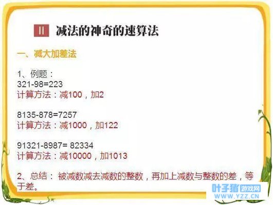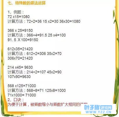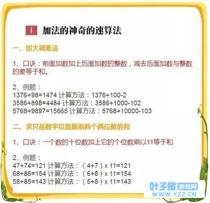 小学阶段,培养学生具有一定的计算能力,是小学数学教学的一项重要任务。尤其是在小学数学学习阶段里,一个孩子的运算能力好与坏,将直接决定她是否能在小升初考入一所重点名校。 许多人都会忽视小小的计算题,认为这个是计算器就可以做到的事。殊不知,小学阶段,最重要的就是计算题。计算做不好,数学永远学不好。精准的计算能力,是学好数学、培养数感的唯一基础。 同时,很多家长也会疑惑,为什么最强大脑里的孩子,计算可以计算的那么快,而且还特别准确。而自家孩子却经常运算速度慢,且存在各种失误,其实,孩子学会良好运算,单单是练习还是不够的,还需要孩子们掌握正确的方法。 在老师看来,想要计算能力“飞快的”提升,除了基础的训练,还需要掌握一定的方法和技巧,现在的孩子都很聪明,只要家长帮助孩子找到适合的学习方法,孩子很快就可以掌握。 为了帮助在计算上存在困难的孩子,老师今天为大家分享一份小学速算法,有需要的家长可以为孩子收藏起来,没事让孩子多运用到计算中,相信对孩子数学学习的提升有非常大的帮助! 更多优秀的教育经验,高效的学习方法,资料,提分技巧以及复习资料等,那么,都可——点击“关注”——私信——发送“资料”二字即可。