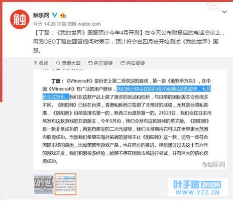 2月16日,网易(Nasdaq:NTES)公布了截至2016年12月31日的第四季度及2016年度财报。随后在财报电话会议中,网易CEO丁磊表示,目前正在做全球化的游戏,不仅是《阴阳师》一个。最为重要的还是《我的世界》(Minecraft)预计将会在4月份进行测试,7月份正式发布的消息。