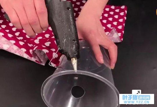 5、用胶棒热熔胶枪在盒子四周的布上打上胶,然后粘上。