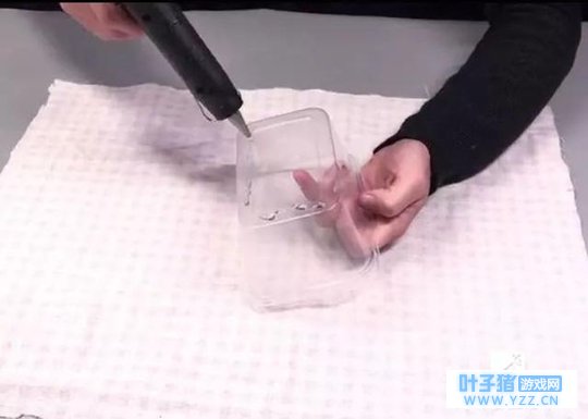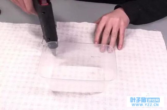 3、用胶棒热熔胶枪在打包盒底下抹上胶,然后把打包盒粘在布上。