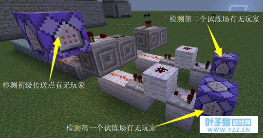 海晶灯为辅助方块,不用建 但要留出位置 检测第一个试炼场有无玩家 ( 循环 不受制约 保持开启 ) :/testfor @p[第一个试炼场 区域 ]