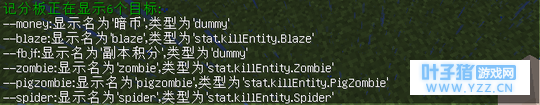 记分板不可缺少 需要统计玩家杀死了多少怪,先创建一些记分板,聊天栏输入: 统计杀死僵尸数量 : /scoreboard objectives add zombie stat.killEntity.Zombie 统计杀死蜘蛛数量 : /scoreboard objectives add spider stat.killEntity.Spider 统计杀死蜘蛛数量 : /scoreboard objectives add blaze stat.killEntity.Blaze 统计杀死僵尸猪人数量 : /scoreboard objectives add pigzombie stat.killEntity.PigZombie