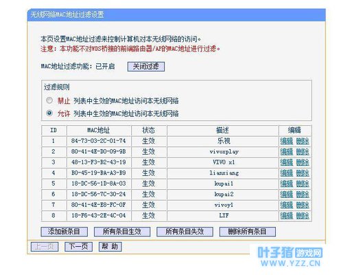 管理页面 接着我们打开无线设置--无线MAC地址过滤: