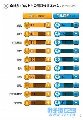 小编只找到了2017上半年腾讯游戏的收益,大家可以管中窥豹一下,下半年的具体排行似乎还没有出来,另外小编做个科普之所以苹果游戏的收益那么高,是因为APP store的游戏收入。