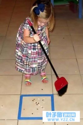 7、在瓷砖周围贴上蓝色的贴纸,让他们把垃圾扫到方框里,他们会认为这只是一场游戏,但他们真正在做的是帮助你做家务。