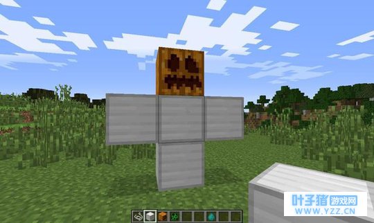 将4个铁块和1个南瓜这样摆放就能合成铁傀儡(南瓜最后放),铁傀儡有着惊人的100点生命值,攻击力最高为21。它会主动攻击周围除了苦力怕之外所有的邪恶生物,并在攻击时将他们抛向空中。 来啊!互相伤害啊!