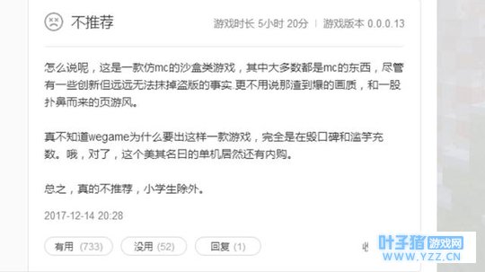 wegame 在Wegame上的评价同样不佳,仅有百分之76的好评率。 但这款游戏能够如此火热不仅在于其联机模式,其贴近中国玩家审美的方块与建筑构造同样居功至伟,比如说下面这样的: