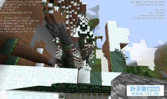 飞到了附近一个比较高的山顶上,向下望去一片深渊,恐高症都快发作了,而这里不只是看起来很高而已,F3调出参数显示此时的高度(也就是y坐标值)已经达到了238,而游戏中允许方块最高的搭建高度是256,从来没见过这么高的山啊!