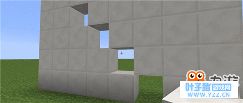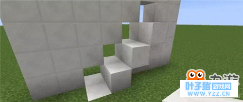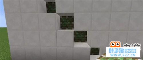 准备好石英块、石英楼梯、粘性活塞、红石中继器、红石粉和拉杆这6件道具后,我们就可以开工了,首先搭一面墙壁,然后在墙上把楼梯所处位置的方块清除~