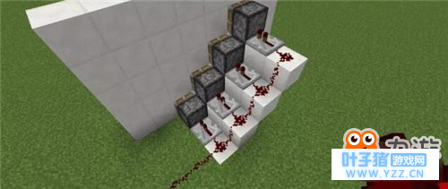 接下来,在墙壁背后用红石中继器和红石粉连通所有的粘性活塞,红石中继器可以按需要设置不同的延时。