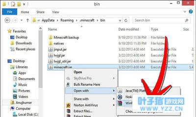 5、用解压软件打开“minecraft”为名的文件,这就是我们一开始说到的文件。你可以右击该文件,然后在打开方式中选择“Winrar”或其他解压缩软件。 注:这个Minecraft文件实际上就是Minecraft .jar文件。之后会用得着这个文件名。 注:你需要安装JAVA环境才能解压jar文件,可参考《如何下载、安装、配置JAVA?》的前两部分。