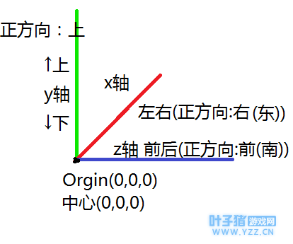 MC立体坐标系 相对坐标:就是以"~"(波浪号)代指当前执行者所在的某一轴上的坐标,比如命令方块在233,233,233的地方,此时命令方块里输入指令/tp @p ~ ~ ~,就会将玩家传送至233,233,233的地方。相对坐标可以加减,只需要在波浪号处输入“+”或“-”一个值就可以加减相对坐标。比如 /tp @p ~ ~1 ~,就会将玩家向上传送一格。怎么加减呢?以执行者的坐标向正方向移动最终定位到这个位置。至于正方向我放出来了。其实也可以打开F3,看三种颜色箭头指的方向就是正方向了(必须对着正方向)。实在不会教大家个方法,看太阳。因为太阳所对应的是x轴的正方向,而太阳是从东边升起的(废话),因此输入/time set 0随即看向太阳,那个方向就是x轴的正方向,由此可以推出来z的正方向(上北下南左西右东),至于y轴...上下没什么好讲的。