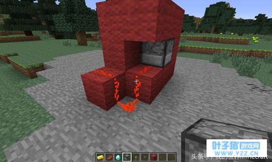 首先把一个发射器像这样用红色的羊毛包起来,不要问我为什么,因为这是“红”包。做好之后设计一个简单的红石开关电路,可以用按钮或者拉杆控制,也可以用压力板或者拌线钩等等做成自动触发。