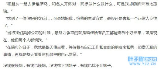 珀尔森在豪宅内随便开个派对一个晚上就花掉了四亿美元,然而却在网络社交上表示自己虽然有钱但并不开心。对话大概如下: