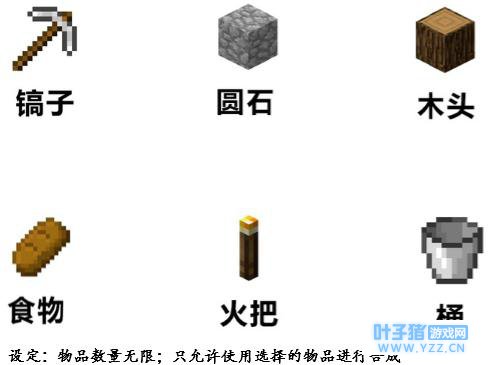 一、下意识的选择:食物+火把+镐子看到这六个方块,小编我麻溜的做出了选择。并且对这种无聊的游戏嗤之以鼻,“什么玩意儿,侮辱智商!” 食物作为生存的根本,这个是必不可少的,探险打僵尸,如果不需要食物,真正的大神。 火把作为生存的曙光,这个也是不可缺少的。夜晚的萤火,下矿的温暖,是保护安全防止刷怪的外出必备品。 镐子作为生存的发展,这个可以说是Minecraft发展的基石了,使用率最高的工具,非镐子莫属。