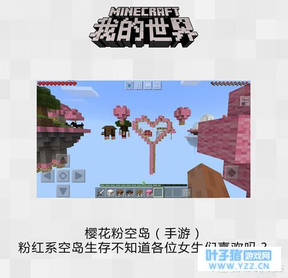 首先是PC端,官博推荐了“糖果世界”,全图都是由粉红系的糖果构建而成,是不是已经勾起了妹纸们的少女心?如果你是手机端也不用怕,官方也在手游中推荐了“樱花浮空岛”组件,一片片心形的粉红色浮空岛,简直可以秒杀一大堆妹纸玩家了。