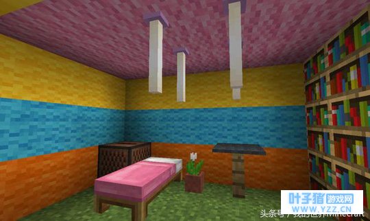 内饰自然也是不能马虎的,首先房间里的灯具选用的是高端大气上档次的末地烛,粉红色的小床凸显出了萌萌哒少女心,书架、唱片机应有具有,真不愧是文艺玩家的房间啊! 好斗者