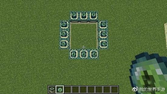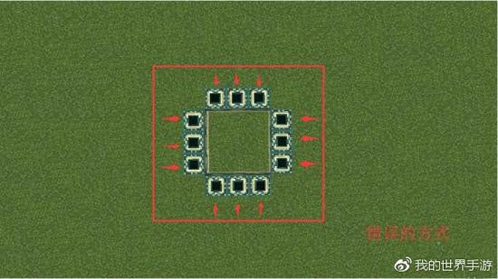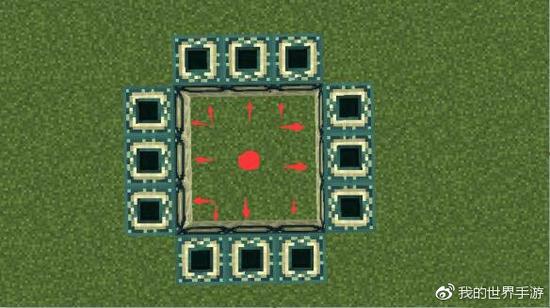 可能看到上面的一个对比,或许有很多小伙伴都会明白了。末地传送门的方块,和活塞一样,是有朝向的。就是说,想要搭建出一个能正常使用的末地传送门,就必须在放置的时候,所有的正面向传送门的中心。 所以,我在搭建正确的传送门的时候,是以自己为中心点,再四周放上方块,让传送门的每个正面,都是面对我自己的:
