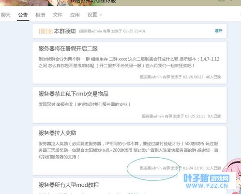 这是那个人在我们服宣传的情况 然后很正常,相信大家都会有的,一些老玩家就准备加群去喷群,被秒踢以后也就没有什么动静了,因为我是懒得去喷所以只是加了群看看。 但让我没想到的是,这个服务器里面的公告居然有这两条