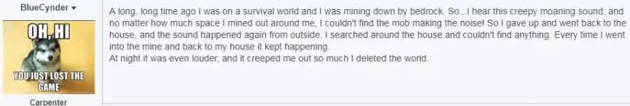 “几年前,我在玩生存模式,已经挖到基岩了,但突然听到了毛骨悚然的呻吟声……一开始我以为是僵尸,但不管我怎么挖,我都找不到声音的来源,于是我放弃了回到屋子里。可怕的是,声音又从外面传来。我在房子四周搜索,没有发现。但只要我一回去房子声音就又出现了,而且一到夜晚声音更大了。这令我十分害怕,于是我删除了那个世界。”