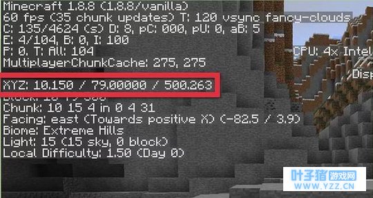 当然,您需要在游戏开始时按F3。点击后,您将在游戏窗口中看到带有坐标的文本,其中X和Y将分别描述您的位置相对于南北方向和东西方向的位置,以及Z-您的相对于海平面的位置。当你开始去某个地方时,坐标将会改变。