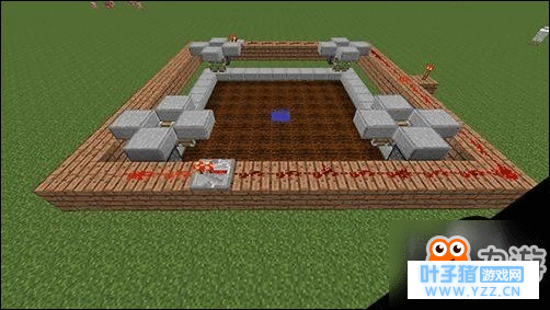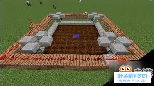7.正式布线,直接用红石绕场一周摆成如图所示的状态,可以看到红石激活的地方活塞也被激活了,左右两边各用一个中继器,中继器的位置如果把握不好的话只需要注意不要在拐弯处放就行了,在其他地方放的距离都大概够传输到活塞。