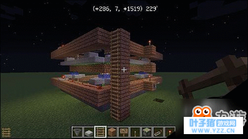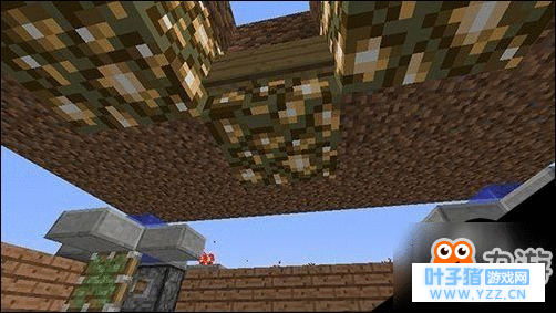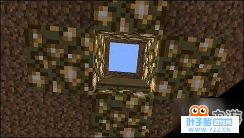 12.还没完,做好二层装置以后我们要从中间的洞到下面去,然后在洞的下方放四个方块,因为考虑到小麦塔是半封闭的中间光照不足所以使用了萤石,如果是在服务器里做没有萤石的话在方块上插火把也是可以的。