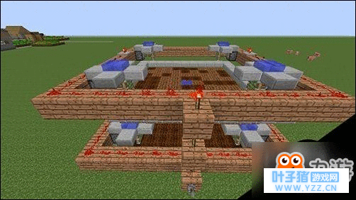因为红石火把的特性,此时中间的火把因为下方火把的关系所以熄灭了,如果我们把下方火把关掉那么中间火把就会被激活,而上方火把会熄灭。 11.接下来和一层一样建造二层就行了,一层的四个水的位置就是中间耕地的四个角。