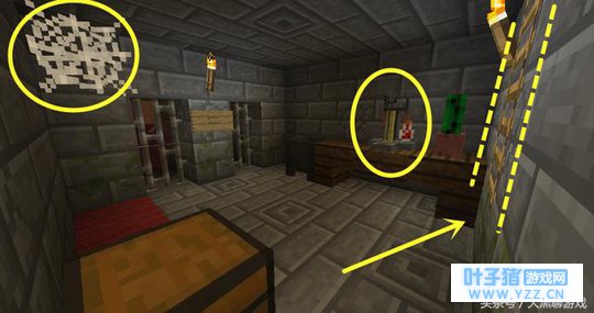 这个也是生成在某个不能说的生物群系中的罕见建筑,图中是该建筑的地下室。在它上层有着熔炉、床、工作台以及红石火把等道具。而在地下室中,还存在着酿造台、铁栏杆以及告示牌。其他的不能再说下去了,说到这里答案都已经呼之欲出了!