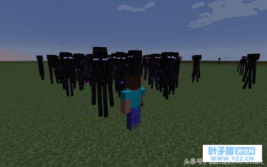 原来由于骷髅的数量太多,再加上他们射箭的准头实在不怎么样,所以后面的骷髅总是射到前面的,于是这场“追杀”马上就变成了骷髅的内战... 末影人 虽说末影人平时并不经常被史蒂夫欺压,但是却经常被“目光调戏”,于是100只末影人选了一个风和日丽的下午,决定吓唬吓唬史蒂夫。