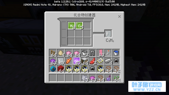 像这样! 这里是合成方法图解教程 我尽力做的很详细了 在第三栏物品栏中找到"化学物创造器" "H"8个 "C"5个 即可在化学物创建器中合成出乳液(C5H8)