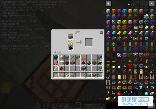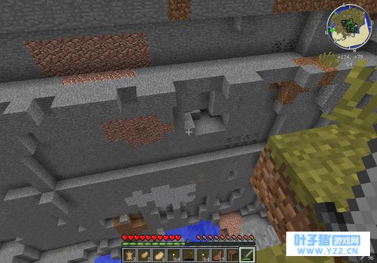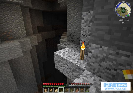 准备好备用的火把,火把合成方法:物品栏内合成栏上面放煤/木炭下面放木棍得到4个火把。如图,右边普通石头上带点黑色的石头就是煤矿石了。煤矿石可以用木镐或等级更高的镐采集,打掉方块后掉落1个煤炭和随机小量经验。煤炭可以做火把,另外还是不错的燃料。